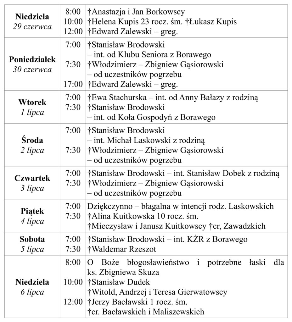 Ogłoszenia duszpasterskie 29 czerwca 2025