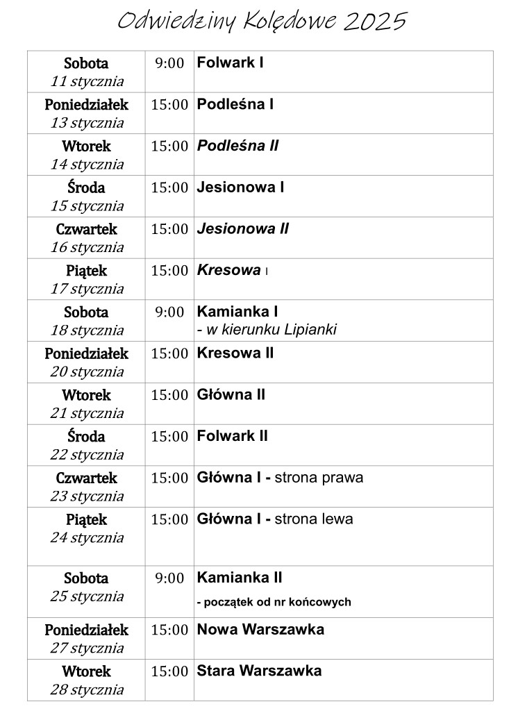 4. W naszej parafii trwają doroczne odwiedziny duszpasterskie, tak zwana kolęda. Pamiętajmy, że kapłan przychodzi do naszych domów i mieszkań, a przede wszystkim do rodzin z Bożym błogosławieństwem. Program kolędy jest na naszej stronie internetowej. Na czas kolędy Mszy św. wieczornych w środę nie będzie.